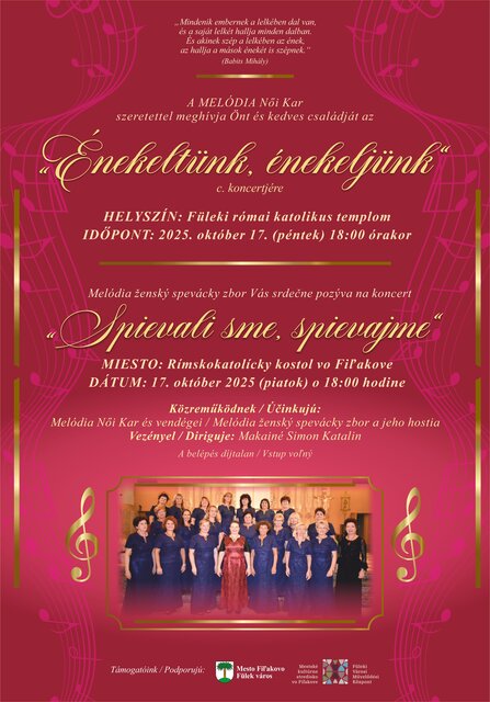 Ženský spevácky zbor Melódia Vás srdečne pozýva na koncert, ktorý sa uskutoční 17. októbra 2025 (v piatok) o 18.00 hodine v Rímskokatolíckom kostole vo Fiľakove.