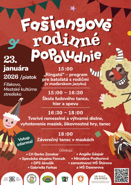 A farsangi családi délután Ringató foglalkozással kezdődik, ezzel egyidőben Gáspár Angéla és Miroslava Podhorová vezetése mellett játszóház és gyerektáncház várja az érdeklődőket. A talpalávalót a füleki Barko Banda húzza, a táncház során megvalósuló daltanítás a Foncsik Énekegyüttes és a Jánošík Gyermek-néptáncegyüttes vezetése mellett zajlik.