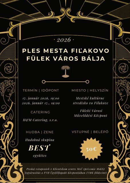 Samospráva Fiľakova Vás srdečne pozýva na novoročný Ples mesta Fiľakovo, ktorý sa uskutoční v sobotu 17. januára 2026 o 19:00 hod. v tanečnej sále mestského kultúrneho strediska. O kvalitnú zábavu sa postará hudobná skupina BEST, o pohostenie vo forme predjedla, večere, dezertu a kapustnice zas H&M Catering, s.r.o. Vstupenky v hodnote 50€ si môžete zakúpiť v klientskom centre MsÚ (bývalý bufet na prízemí MsKS).
