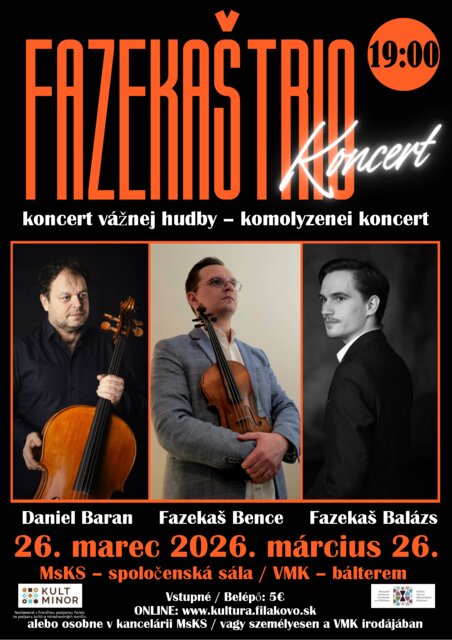 Mestské kultúrne stredisko pozýva priaznivcov klasickej hudby na koncert Tria Fazekaš, ktorý sa uskutoční 26. marca o 19.00 hodine v spoločenskej sále Mestského kultúrneho strediska vo Fiľakove.
